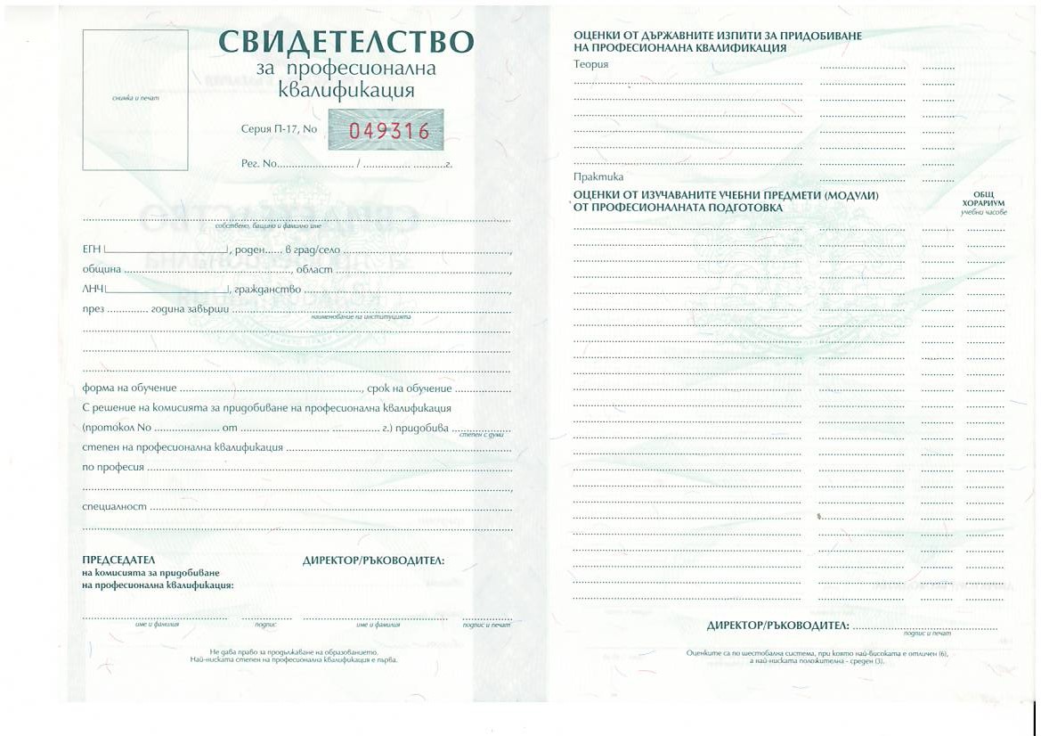 СВИДЕТЕЛСТВО за професионална квалификация