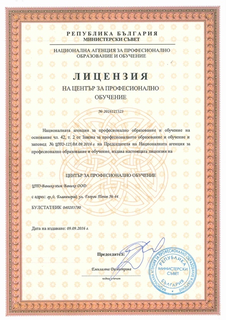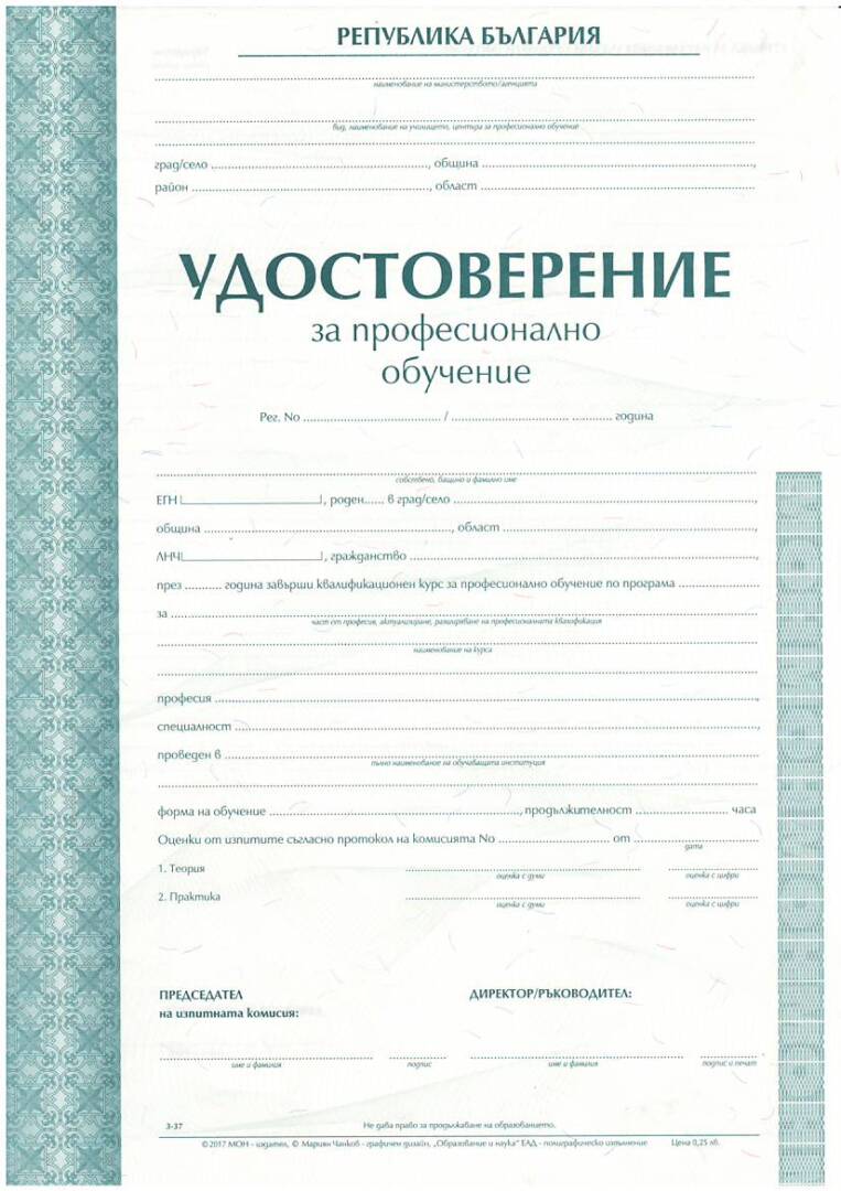 УДОСТОВЕРЕНИЕ за професионално обучение